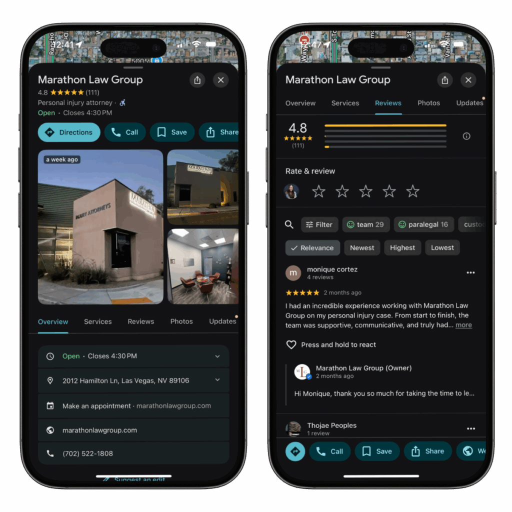 Example: Marathon Law Group uses its Google Business Profile to showcase client reviews, reinforcing their credibility as a trusted law firm.